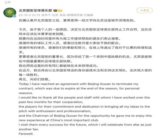 中秋节前一晚,中国足坛传出一条相当重磅的消息:正率领北京国安争夺中超冠军的名帅塞蒂恩,辞职了!根据北京国安官方渠道发布的公告,塞帅是因为“个人及家庭原因”主动挂印而去。不过明眼人都看得出来,塞蒂恩离开国安帅位,最大的原因还是国安战绩的下滑。执教过巴萨,带过梅西的教练都不一定带得动球队,执教中超和中国国字号队伍的难度,着实比不少外国教头想象中大不少。