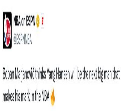 随后,名记文霍斯特表示:“杨瀚森有可能成为NBA里很重要的球员,因为他关系到NBA能否重新激活中国市场。要知道,我们已经过了“姚明时代”,但姚明当年在中国培养了数以百万计的NBA球迷,所以中国市场对NBA来说至关重要。”