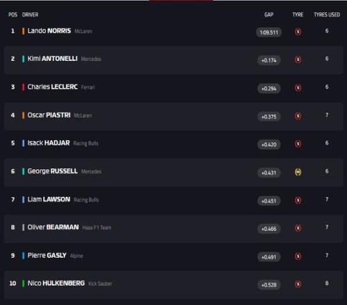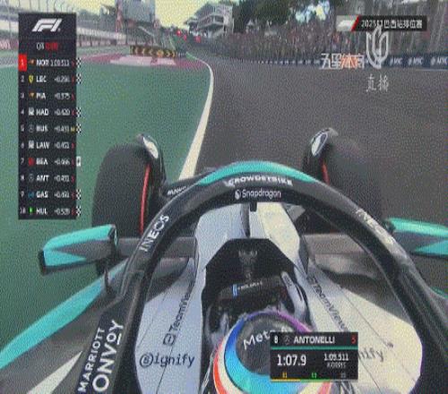 不过,本周末状态出色的诺里斯依旧无人能挡,以1:09.511的成绩获得杆位。随后,小将安东内利异军突起!他在第二和第三计时段表现极为出色,虽然未能超越诺里斯,但依旧跑出1:09.685的成绩刷掉勒克莱尔获得第二!正赛将从第一排发车。