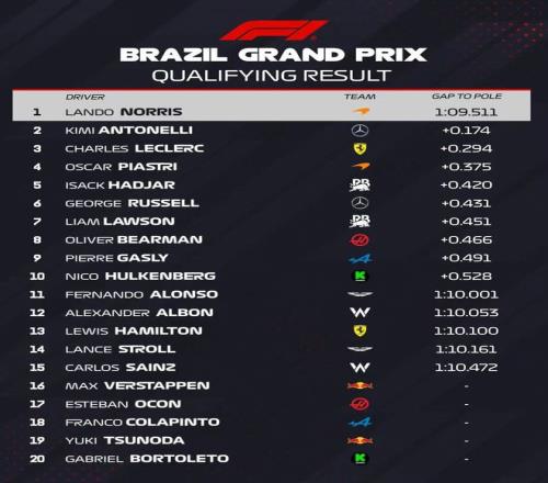 北京时间11月9日凌晨,2025赛季F1迎来巴西站排位赛的争夺。最终,诺里斯依旧延续着自己本周末的出色状态获得杆位!安东内利获得第二,勒克莱尔获得第三。皮亚斯特里表现平平获得第四,正赛从第二排起步。