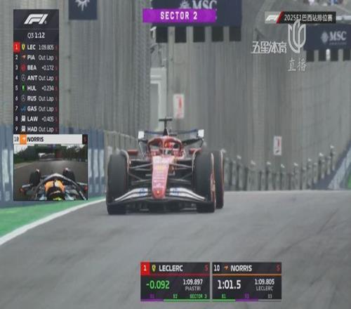 Q3的杆位争夺一触即发,皮亚斯特里率先刷到第一,但此后勒克莱尔在第一计时段刷紫领先皮亚斯特里0.146秒,又在第二计时段领先0.001秒,以0.092秒的优势短暂刷到第一!