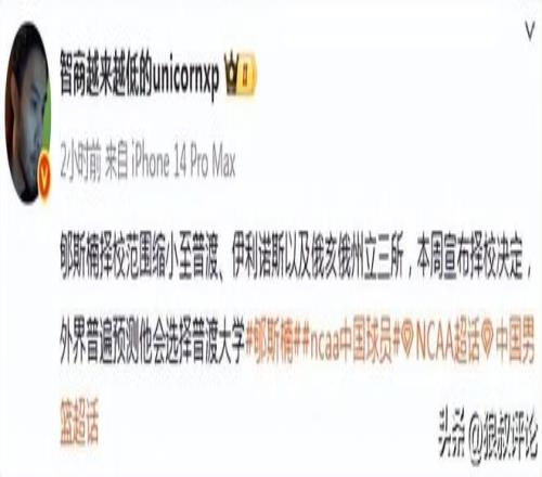 北京时间11月11日,据知名体育招募网站On3记者Joe Tipton报道,中国球员、18岁的四星中锋郇斯楠已经将大学择校范围缩小到三所学校——普渡大学、伊利诺伊大学和俄亥俄州立大学。