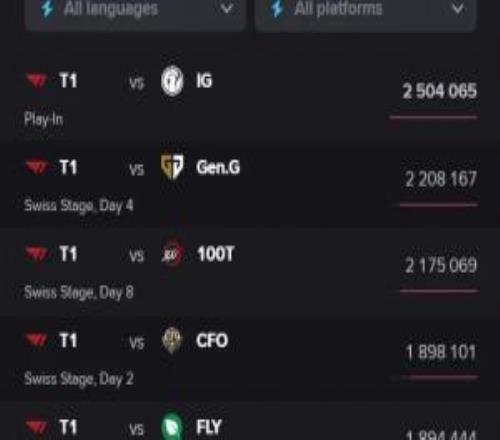 S15世界赛海外收视峰值前五名:T1目前五场比赛占据热度前五